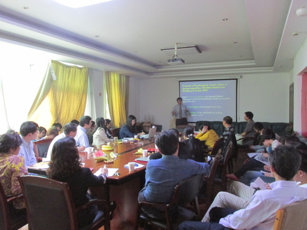 王晋校友以“�运教练心理学和高水平运动技能训练原则”(Olympic Coaching Psychology and Advanced Sports Technical Training Principles)为题,从运动员在训练和比赛中的表现差异谈起,介绍了开放性运动技能(open motor skills)和闭锁/闭合性运动技能(closed motor skills)的特征及其对运动竞赛成绩的影响,并对“反应时模型”(reaction time model)的阶段变化规律进行了分析。在此基础上,王晋校友从脑科学、认知心理学的角度进一步指出运动技能迁移是运动技能习得(Applied Motor Learning)的关键原则。作为运动心理学和运动训练学领域的专家,他还结合自己在各国高水平运动队的工作经历,分享了奥运会等大赛前运动员日常管理和状态调控的成功经验,并就“如何帮助运动员解除赛前心理紧张状态”、“怎样科学方法设计训练方案”等问题与在场师生进行了互动交流。