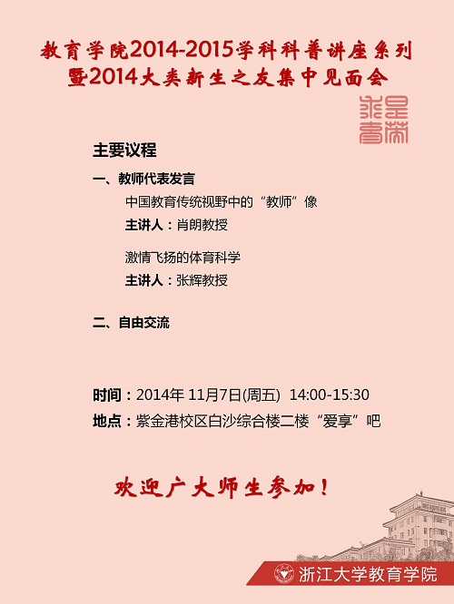 为更好地发挥新生之友“师亦是友友亦是师”的作用,帮助新生更好融入大学生活,教育学院举办2014级大类新生之友集中见面会,搭建新生与新生之友面对面沟通交流的平台。见面会另设置了学科科普讲座环节,增进新生对教育学院各学科的了解。