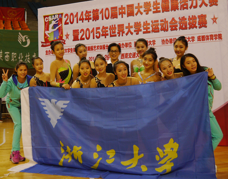 2014年第10届中国大学生健康活力大赛暨2015年世界大学生运动会选拔赛于11月26-30日在成都西南交通大学举行,本次大赛艺术体操项目共有来自24所高校的466名运动员参加比赛。由我校教育学院运动训练专业12位同学组成的浙江大学艺术体操队参赛并夺得高水平组9金6银,体育院系组个人项目2金3银的优异成绩;王曼亲同学再次荣获最佳表现奖,金莹、季倩倩同学荣获优秀运动员称号,带队教练单亚萍获优秀教练员、最佳编排荣誉;同时,浙江大学艺术体操队还获得了代表中国大学生参加2015年世界大学生运动会艺术体操比赛的资格。