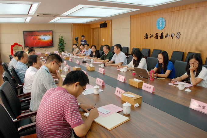 为加强基础教育与高等教育的有效衔接与合作交流,推动浙江省萧山中学教育事业全面、优质、均衡、可持续发展。2015年6月24日下午浙江大学教育学院与浙江省萧山中学签约揭牌仪式在萧山中学举行。浙江大学本科生院招生处有关领导、浙江大学教育学院领导、萧山教育局领导、萧山中学领导、双方合作项目负责人及相关科室人员出席了此次仪式,会议由萧山中学沈朝晖副校长主持。