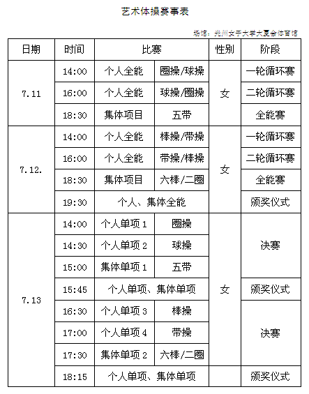 7月3~14日,第28届世界大学生运动会在韩国光州举办。浙江大学艺术体操队代表中国出征,校党委副书记严建华领队。CCTV-5于11~13日直播本次大赛的艺术体操赛事(附赛程表)。欢迎师生一起关注,分享我校体育人才培养的最新动态。