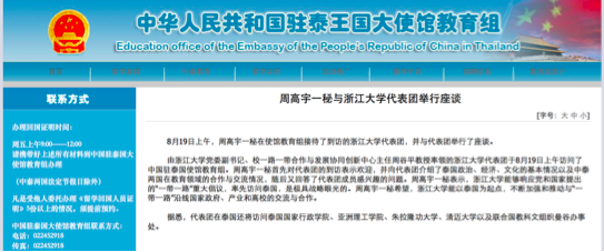 为响应党和国家提出的建设“一带一路”重大倡议,加强我校与“一带一路”沿线国家高校的交流与合作,由浙江大学党委副书记、浙江大学“一带一路”合作与发展协同创新中心主任周谷平教授率领的浙江大学代表团于2015年8月19日访问了中国驻泰国大使馆教育组。代表团由教育学院、医学院、生工食品学院和外语学院等学院的师生组成。