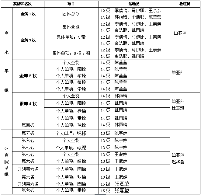 在本届赛事上,由教育学院运动训练专业12位同学组成的浙大艺术体操队在单亚萍老师的带领下,与来自21所高校和体育院系的183名运动员同场竞技,凭借扎实的功底与出色的发挥技压群芳,获得高水平组集体和个人项目的全部9枚金牌以及4枚银牌,体育院系组个人项目一个第5名、六个第6名、两个第7名(获奖名单详见附表)。