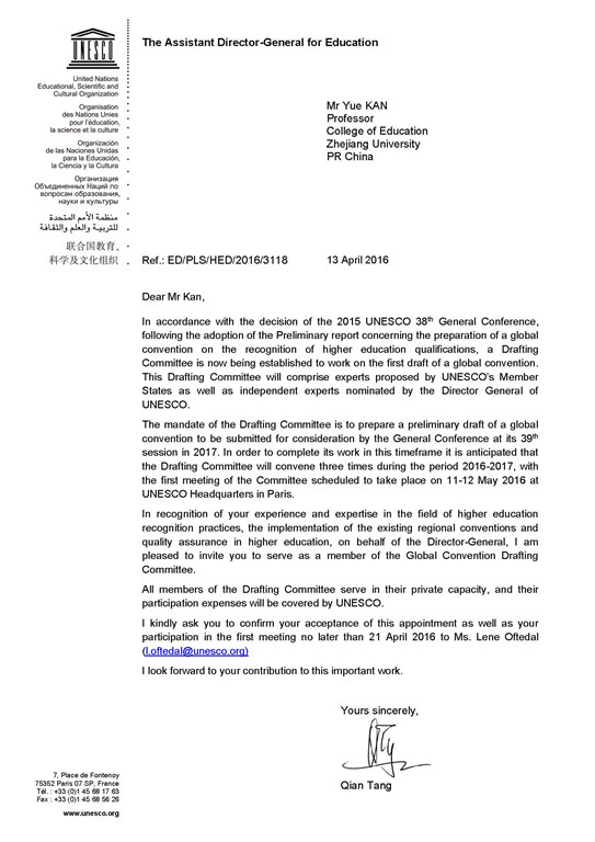 日前,联合国教科文组织教育助理总干事唐虔代表总干事博科娃致函我院阚阅博士,任命其成为承认高等教育资历全球公约(以下简称全球公约)起草委员会专家。