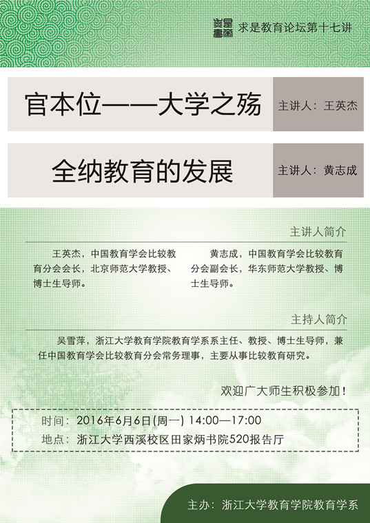 求是教育论坛第17讲――“官本位―大学之殇”&“全纳教育的发展”