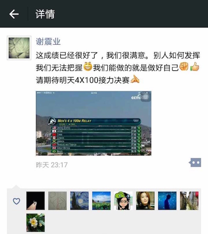 在去年的北京田径世锦赛上,中国男子4*100米接力队获得银牌,此次里约奥运会肩负着再次突破的期待。赛场上,谢震业与队友们表现稳健、交接流畅,最终以37秒82的成绩获得小组第二,顺利进入决赛,37秒82的成绩也刷新了原37秒92的亚洲纪录。