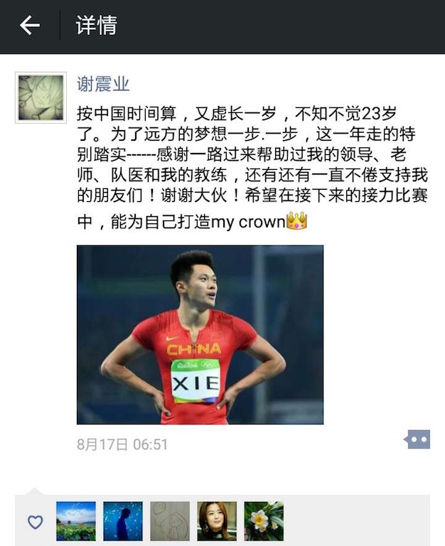 北京时间8月18日晚,2016年里约奥运会田径比赛男子4X100米预赛打响,由浙江大学运动训练专业2016届本科毕业生、2016级预录取研究生谢震业及三名队友组成的中国队表现出色,以37秒82的成绩获得小组第二晋级决赛,并打破了该项目的亚洲纪录。