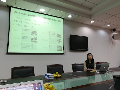 在开始正式的演讲之前,蒋佳先和在场所有的硕士以及博士交流了各自的毕业选题以及在当前学术研究过程中遇到的困难和问题,具体包括比较教育专业同学收集国外资料的渠道问题,质性以及量性的研究方法的使用和评价的问题,如何做文献综述以及对于一个主题研究思路的修改和确立等等。在与在场的同学交流了各自的论文选题以及遇到的问题之后,蒋佳正式开始了自己的演讲:主线是介绍UCLA教育与信息研究生院的教育学博士培养体系和课程,暗线是回答现场同学在开场前所提出的困惑。