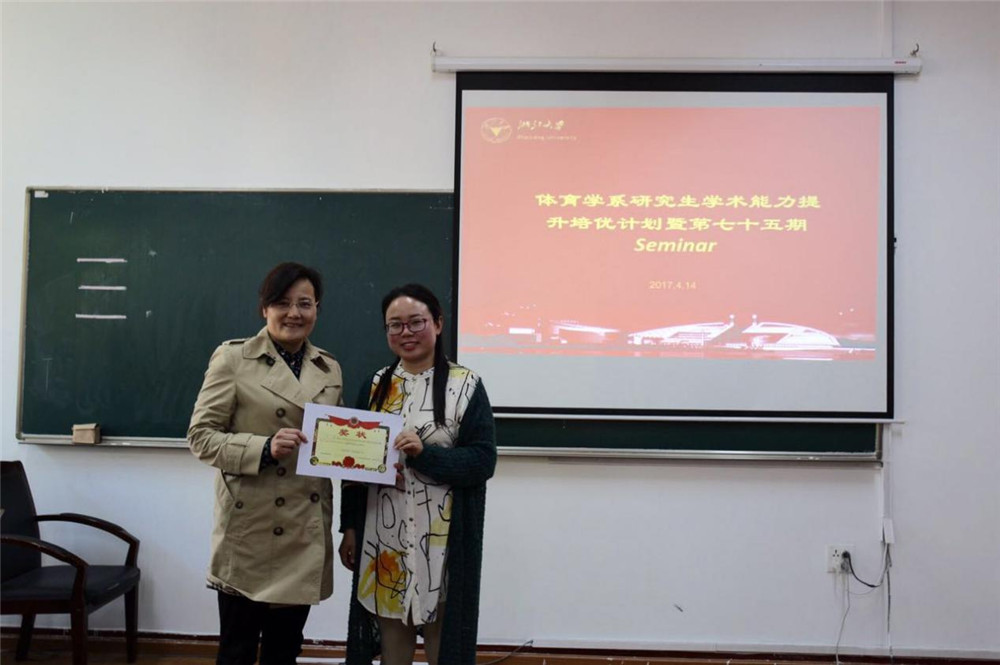 在报告过程中,与会同学就自己感兴趣的内容对三位报告同学进行提问,台上台下交流互动频繁。三位同学汇报结束后,于可红老师分别针对每位同学汇报中存在的问题给出了具体修改意见,并在体育教育学领域作了补充说明,就同学们未来的研究方向给出了指导意见。最后,通过大家投票决定,甘小梅同学当选为本期seminar最佳报告人,活动在浓厚的学术探索气氛中圆满结束。