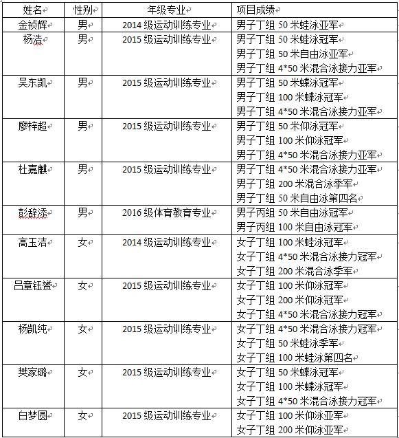 本次比赛,体育学系运动训练专业共派出11名同学参加丁组与丙组赛事。女子项目中,2014级高玉洁获女子丁组100蛙泳冠军,2015级吕章钰�获女子丁组100米仰泳、200米仰泳冠军,2015级樊家璐获女子丁组50米蝶泳、100米蝶泳冠军,高玉洁、吕章钰�、樊家璐和杨凯纯在女子4*50米混合泳接力赛中勇夺冠军;男子项目中,2015级廖梓超获男子丁组50米仰泳、100米仰泳冠军,吴东凯获男子丁组50米蝶泳、100米蝶泳冠军,杨浩获男子丁组50米蛙泳冠军,2016级彭辞添获男子丙组50米自由泳、100米自由泳冠军。(具体成绩详见附表)