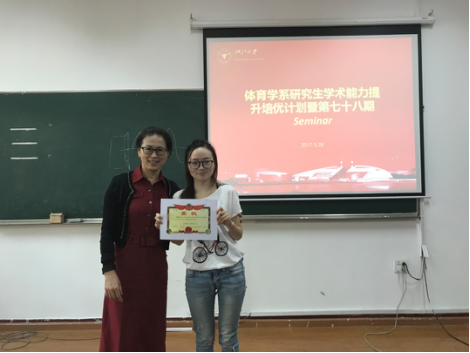 2017年5月26日上午,体育学系研究生学术能力提升培优计划第78期SEMINAR暨2017年第9期在西二教学楼222教室举行。体育学系单亚萍老师应邀担任点评嘉宾,本系2015级、2016级研究生参加活动。