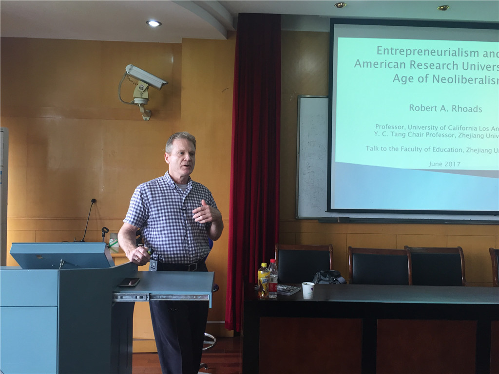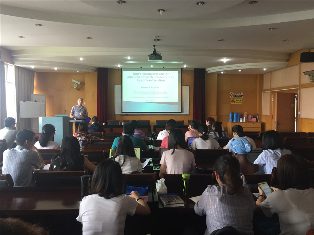 2017年6月14日上午,教育学系求是教育论坛第三十讲顺利举行。美国加州大学洛杉矶分校教育与信息研究生院教授、“全球化和高等教育研究中心”主任罗伯特•罗兹教授为师生带来题为“新自由主义时代的创业精神和美国研究型大学”的讲座。教育学系系主任吴雪萍教授、副系主任孙元涛副教授及各系所师生50余人参会。讲座由教育学系比较教育教研室主任刘淑华副教授主持。