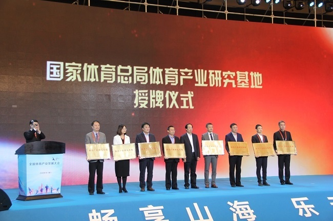 2018年1月12日至13日,由国家体育总局主办,福建省体育局、厦门市体育局承办的2018年全国体育产业发展大会在福建省厦门市召开,来自国家体育总局、国家发展改革委等20个部委代表、各省(区、市)体育局领导、体育产业界企业代表、金融业管理者、业界学者等共539人参与本次大会。会上,我校成功入选首批16家国家体育产业研究基地,国家体育总局副局长赵勇向入选首批国家体育产业研究基地,以及新一批国家体育产业示范基地的单位授牌,教育学院副院长周丽君教授代表学校参加授牌仪式。