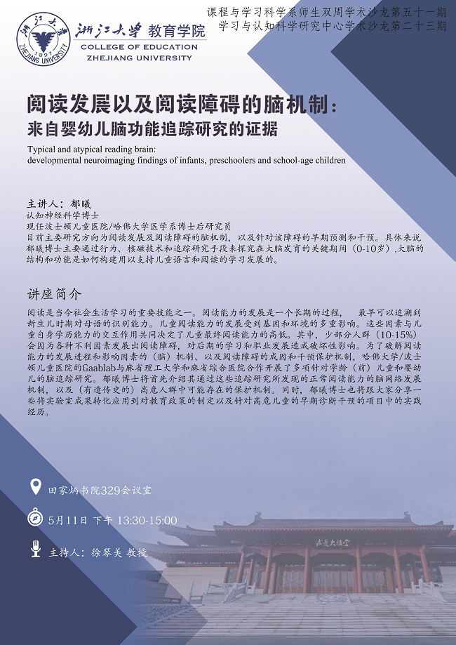 课程与学习科学系师生双周学术沙龙五十一期暨学习与认知科学研究中心学术沙龙第二十三期:阅读发展以及阅读障碍的脑机制