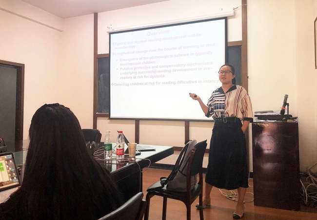 5月11日下午,课程与学习科学系师生双周学术沙龙五十一期暨学习与认知科学研究中心学术沙龙第二十三期在田家炳书院329会议室顺利举行。波士顿儿童医院、哈佛大学医学系博士后研究员,认知神经科学博士郁曦应邀作题为“阅读发展以及阅读障碍的脑机制:来自婴幼儿脑功能追踪研究的证据”的主题学术报告。沙龙由课程与学习科学系主任徐琴美教授主持,学院各系所师生共同参加。
