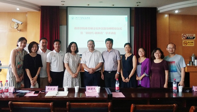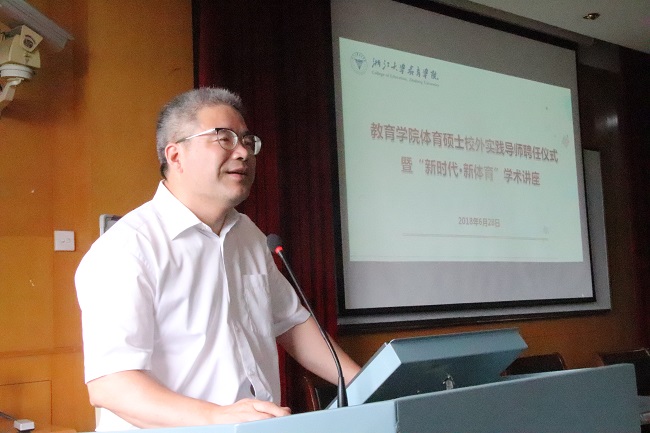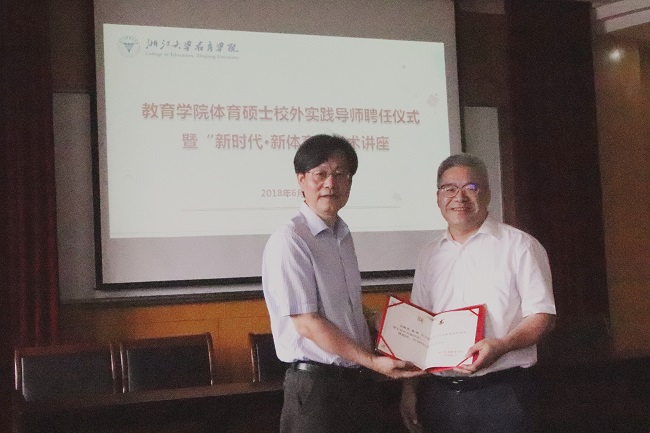 6月28日下午,浙江省体育局李华副局长受聘浙江大学教育学院体育硕士校外实践导师仪式暨 “新时代•新体育”学术讲座在田家炳书院520报告厅顺利举行。浙江省体育局副局长李华、体育局经济处主任科员舒登攀、浙江省体科所体育产业研究中心副主任陈文聪,浙江大学教育学院院长顾建民、副院长周丽君,体育学系张辉教授、郑芳教授,以及体育学系近80名师生参加了聘任仪式和讲座。本次活动由副院长周丽君主持。