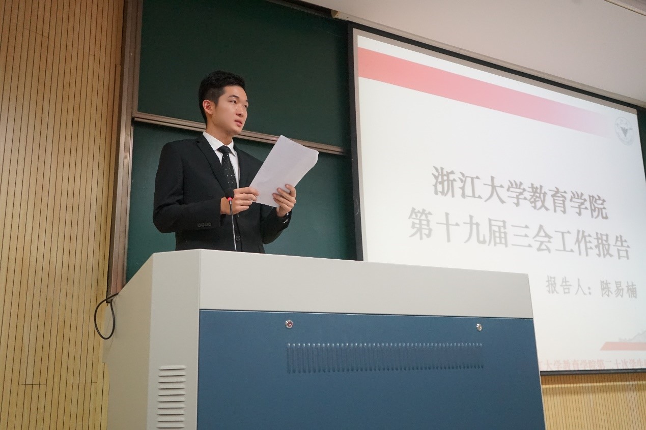 接下来,学生会主席陈易楠同学向与会代表作了《浙江大学教育学院第十九届三会工作报告》。他分别从思想引领、内部建设、学术服务、文体活动、社会实践五个方面切入,总结回顾了教育学院三会在这一年中取得的丰硕成果。陈易楠同学指出,在今后的工作中,三会应该以广大教院学生各项权益为出发点,创新思想引领的活动形式、巩固创新品牌活动、加强组织建设工作、更好地服务师生。最后,陈易楠同学代表三会成员,对热心支持和帮助三会工作的领导、老师、同学表达了衷心的感谢,并预祝新一届三会能以崭新的面貌开拓美好的未来。