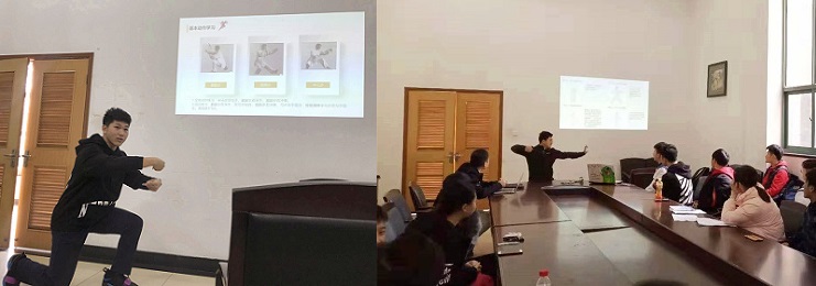 徐晓洋同学以“螳螂拳”为题,将基本步型与基本手型为切入点展开教学。他谈到螳螂拳和太极拳有相似之处,都对下肢力量要求特别高,所以要特别针对学生腿部力量制定专门有效的训练。徐晓洋认为,象形拳的教学需要让学生更多去回忆,揣摩动物的行为。