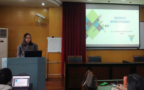 刘徽副教授以“真实性学习:培养解决问题的能力”为题作报告,介绍了关于真实性学习的研究框架,从范式层面的改革、真实问题情境的特征以及真实问题的五个步骤等三方面对真实性学习进行了系统阐述。刘徽老师以“我们为什么要研究核心素养?”为导入,并结合大量理论和实例对这一问题进行深入探讨,总结出了真实问题情境的三个特点,即现实的逻辑、复杂的情境脉络和开放的学习环境。随后,刘徽老师进一步解答了构建真实性问题的五个步骤,即引入现实世界的问题情境、贯彻专家思维、提供脚手架、促进群体知识建构和提升元认知。