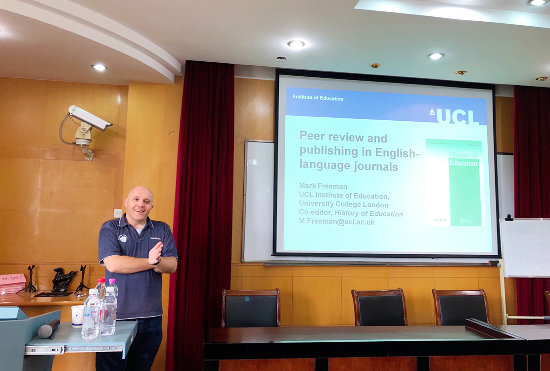 Freeman博士首先从中国学者普遍关心的英文学术论文、特别是SSCI期刊论文发表的难处和压力作为开场,引起在场师生的广泛共鸣,并以自己所在的《教育史》杂志为例,对教育学英文学术期刊的发表状况进行整体介绍。通常,英文期刊每卷包含2到6期,每篇文章字数在6000到10000不等,因各杂志特色和需求而定;部分杂志也接受书评的发表,书评一般在500到2000字之间。教育学英文学术论文整体而言包含引言、文献综述、研究方法、研究结果、讨论和结论6个部分,不同研究主题和学科也会在文章风格上略有差异。Freeman教授将教育英文期刊分为三种类别,分别是教育学通科类期刊(general education journal)、学科专业类期刊(disciplinary specialism)、以及反映不同研究兴趣的主题专业类期刊(subject specialism),并分别以《英国教育研究杂志》(British Journal of Educational Studies)、《教育史》(History of Education)和《教学法、文化与社会》(Pedagogy, Culture & Society)三本期刊为例,对三种类别进行了区分。基于此,Freeman教授认为教育学者发表英文学术论文的最重要原则在于“选择正确的期刊”。