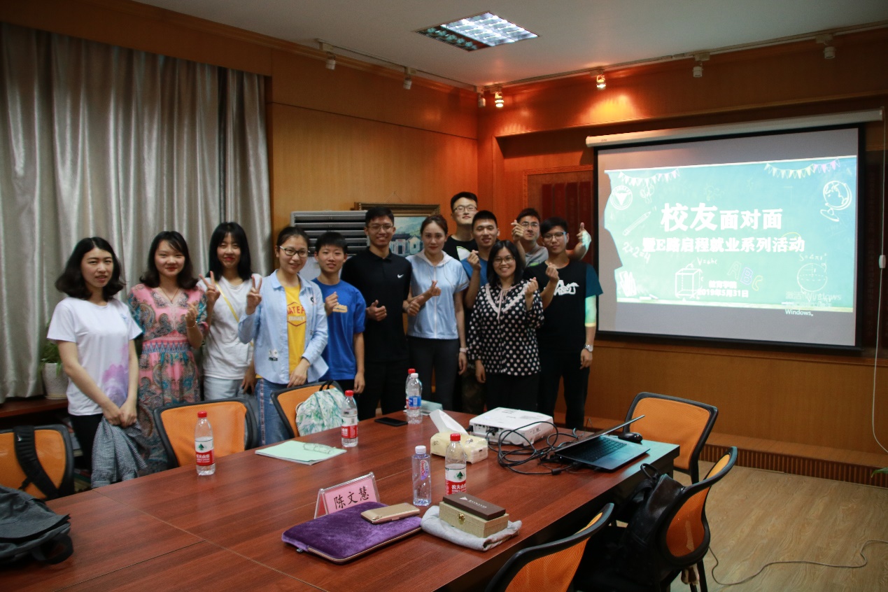 5月31日晚,浙江大学教育学院“校友面对面”第一期暨E路启程就业系列活动在田家炳书院120室顺利举行。本次活动邀请到了杭州跃动客体育的创始人、浙江大学教育学院2016届优秀校友陈文慧分享她的学习经验和创业故事。学院科研与合作科科长姚加丽老师、党政办副主任苏洁老师、团委辅导员蒋闰婧老师以及学院青马二期学员、部分学生代表共同参与本次活动。