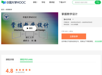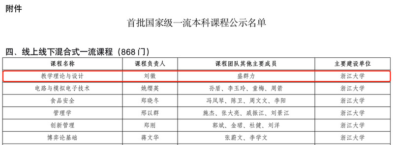 近日,教育部公示了首批国家级一流本科课程认定结果,我院刘徽老师、盛群力老师及其团队的《教学理论与设计》成功入选,被认定为“首批国家级一流本科课程”(线上线下混合式一流课程)。本次评选中,浙江大学共有42门本科课程(其中线上线下混合式一流课程6门)获得国家级一流本科课程认定。