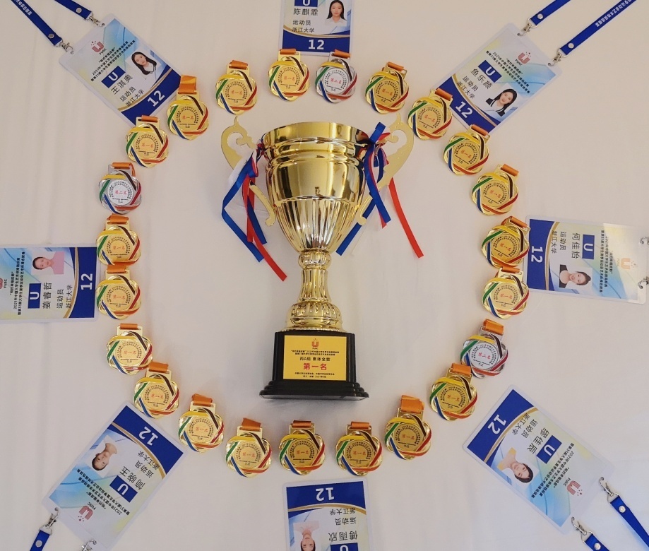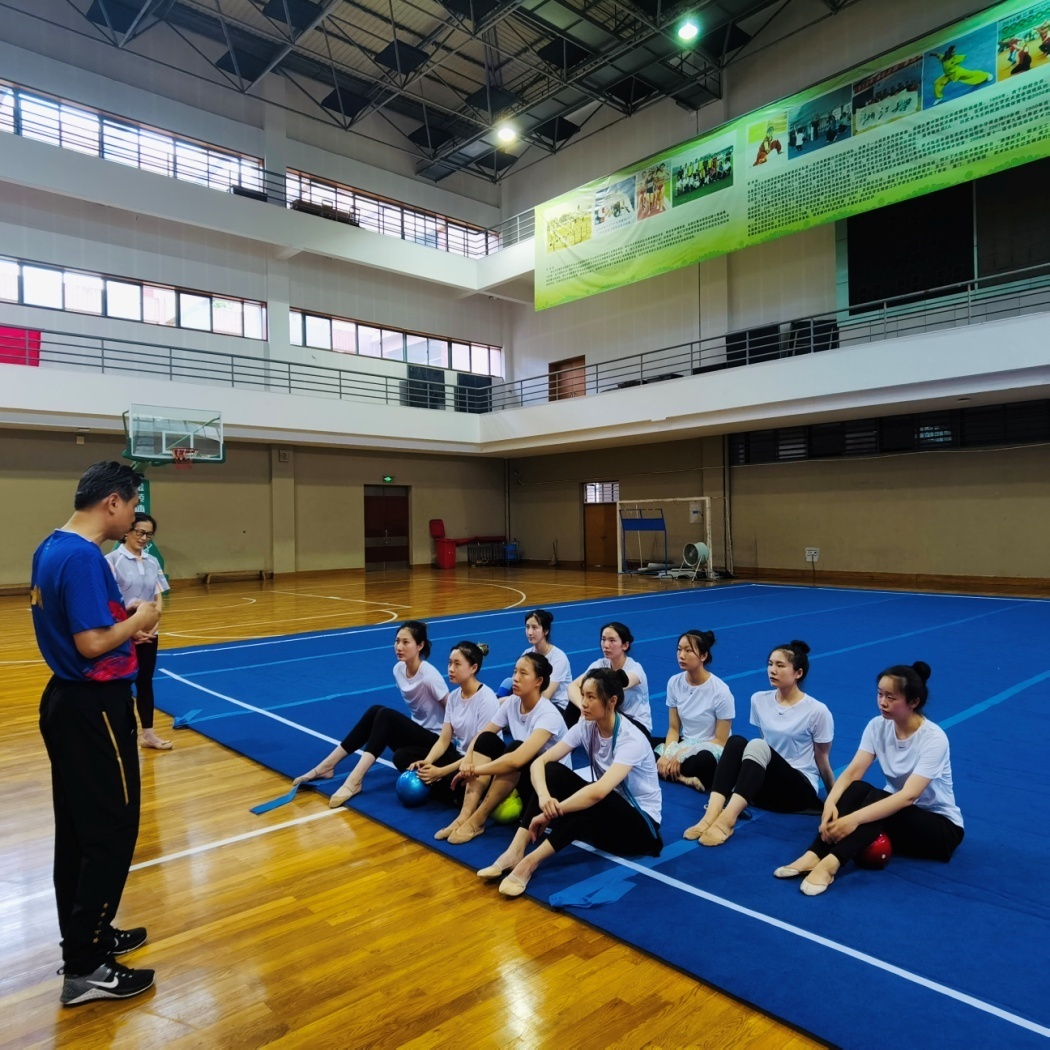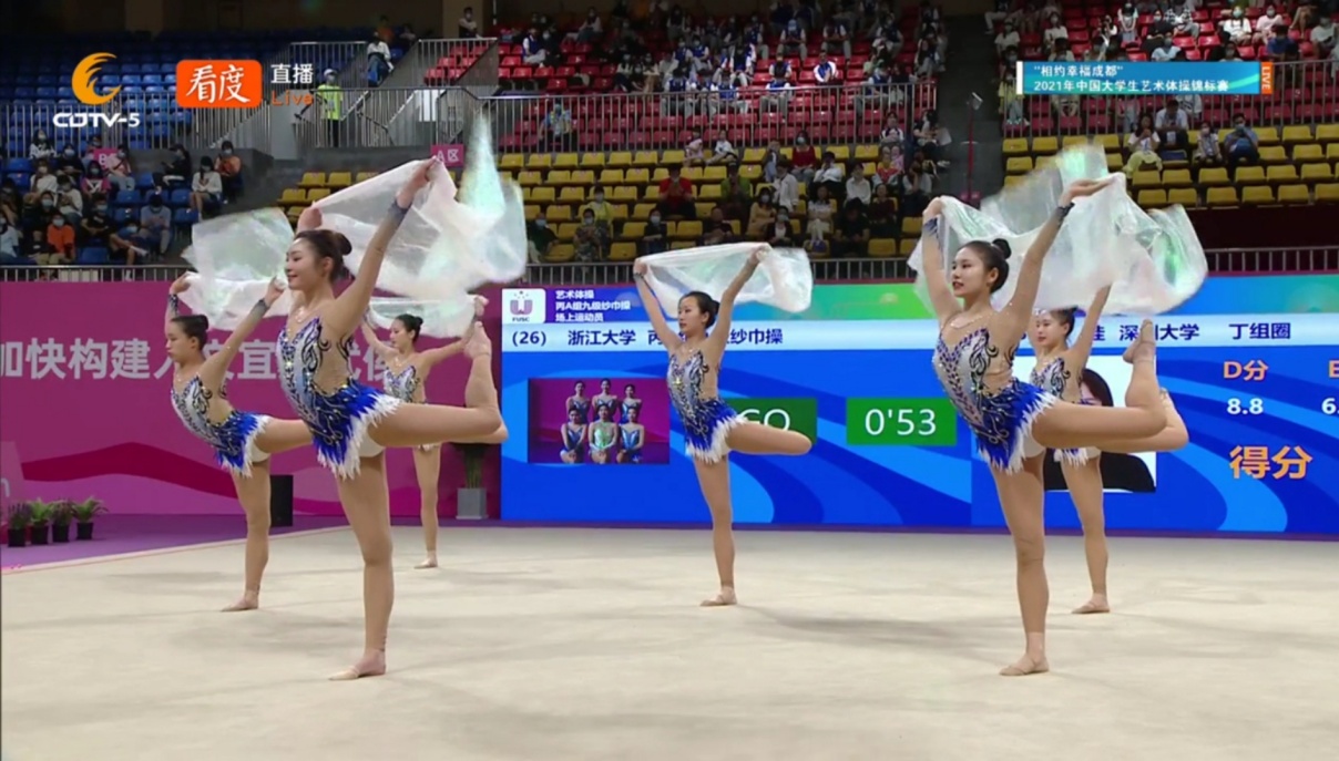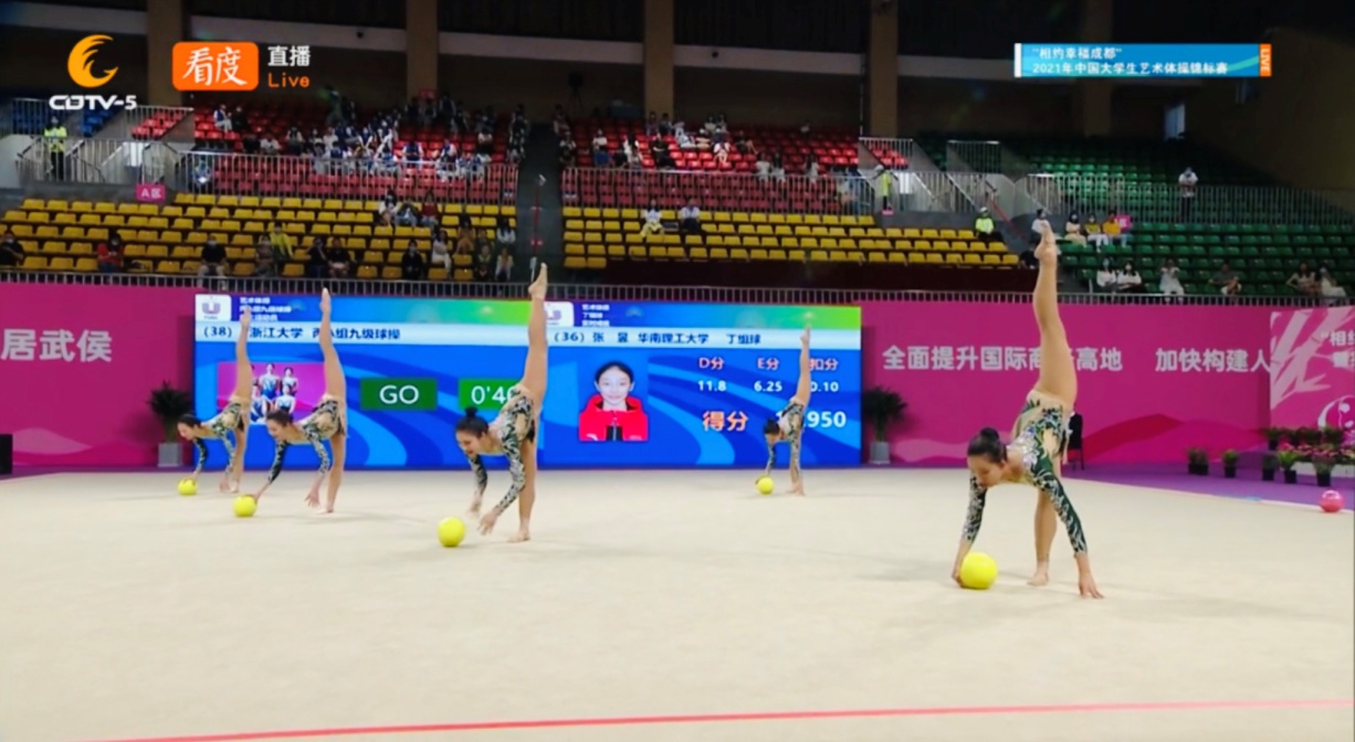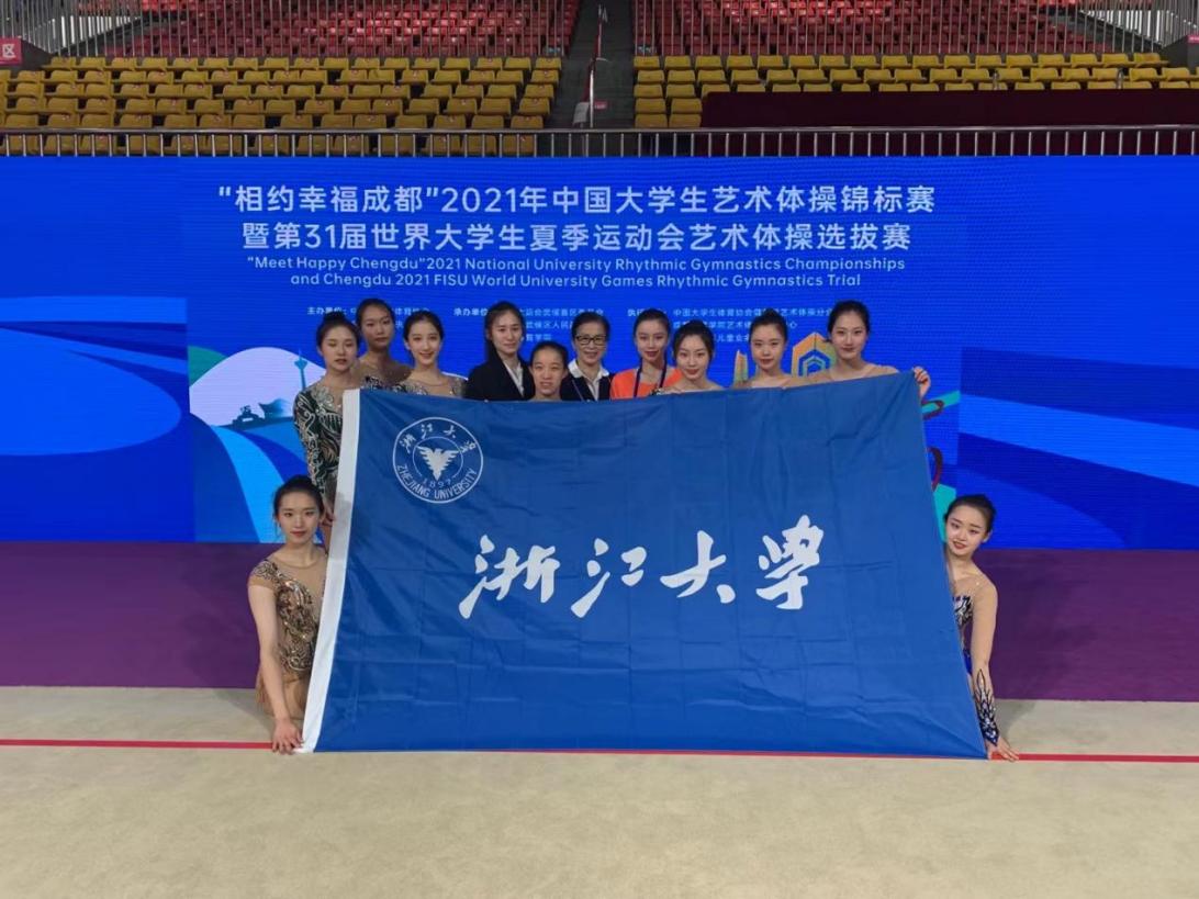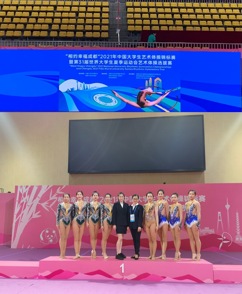 “相约幸福成都”2021年中国大学生艺术体操锦标赛暨第31届世界大学生夏季运动会艺术体操选拔赛于四川省成都市举行,来自全国31所高校艺术体操队伍的284名运动员参加了本次大赛。浙江大学艺术体操代表队由教育学院体育学系运动训练专业9名同学组成,系主任张辉老师担任领队,单亚萍和张玲老师担任教练,徐晓岚同学担任助教,共参加了体育院校丙A组集体和个人9个项目的比赛,最终获得8金3银的优异成绩。