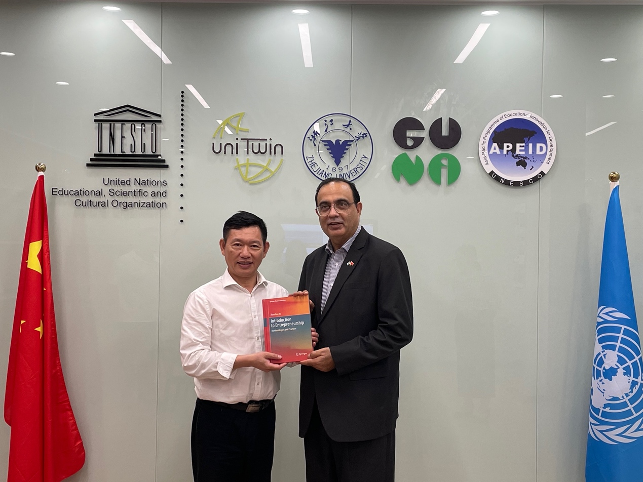 会见后,夏泽翰教授访问了联合国教科文组织浙江大学创业教育教席。联合国教科文组织浙江大学创业教育教席主持人、联合国教科文组织中国创业教育联盟主席、浙江传媒学院校长徐小洲教授、浙江大学教育学院副院长阚阅教授、教育学系副主任梅伟惠教授、“百人计划”研究员吴寒天博士及相关人员参加会谈。