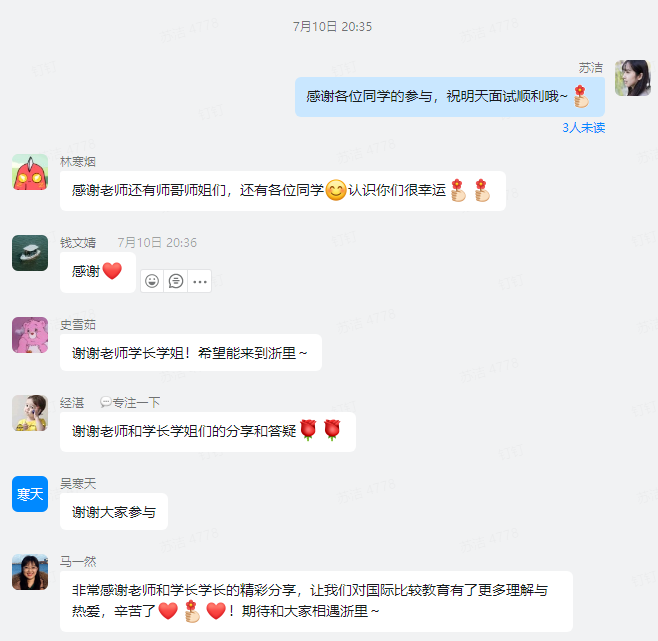 为了让营员们近距离感受浙江大学的风貌,增进对学校学习与生活的了解,本次夏令营活动特地录制“学长学姐带你‘云’游紫金港”和“小研的一天”vlog,从不同角度展示和讲述“求是园”的精彩。此外,本次夏令营特设“成长对话”环节,邀请了30余名学科教师、在校研究生以及年轻校友与营员们针对专业学习、实践就业、国际交流、未来规划以及校园生活等方面互动交流、答疑解惑。7月11日,夏令营营员们参与了学科研究能力与综合素质面试。