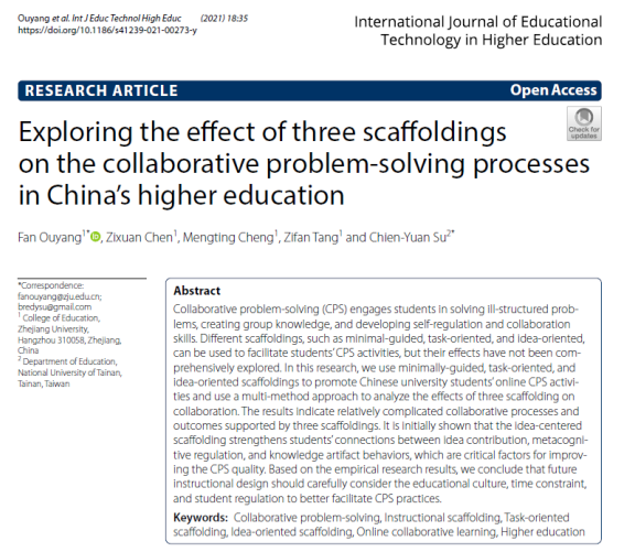 论文Exploring the effect of three scaffoldings on the collaborative problem solving processes in China’s higher education相关研究设计并探究了三种不同协作问题解决脚手架对学生在线协作过程及效果的影响。在该研究中欧阳璠指导浙江大学教育学院本科生SRTP团队(陈梓萱,成梦婷,唐子凡)利用学习分析方法分析了教学过程性数据,并基于研究结果提出相关教学设计及发展策略。