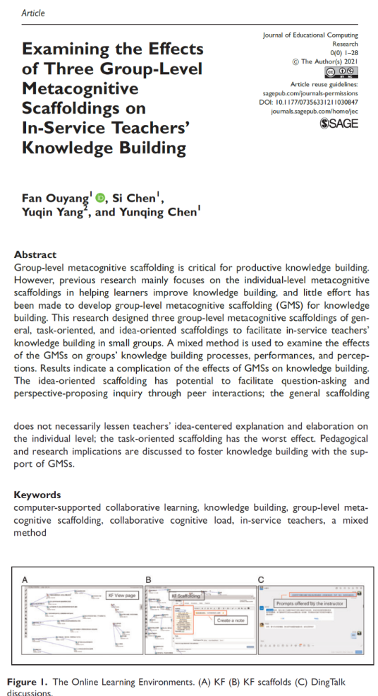 论文Examining the Effects of Three Group-Level Metacognitive Scaffoldings on In-Service Teachers’ Knowledge Building相关研究与华中师范大学杨玉芹副教授团队合作,在知识论坛(Knowledge Forum)及钉钉平台设计了三种小组层级的元认知脚手架,旨在支持中小学教师知识建构过程,并利用混合式学习分析方法检查不同小组教师的知识建构过程及效果,基于研究结果提出知识建构脚手架设计及应用的教学启示。