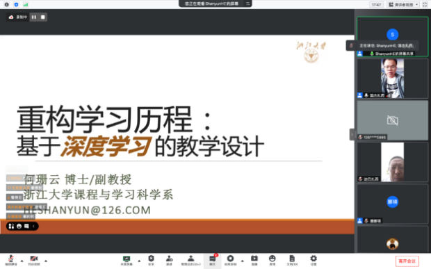 8月11日下午,浙江大学教育学院课程与学习科学系何珊云副教授作题为“重构学习历程:基于深度学习的教学设计”的讲座。何珊云老师通过教学案例介绍了“情境”在学习及教学设计中的重要性,引出“深度学习”的本质及意义,并围绕“培养怎样的学习者”“学习方式如何变革”“学校与教师该如何做”三个问题展开具体阐述。何珊云老师指出,要通过基于深度学习的教学设计培养学生的核心素养,帮助学生掌握未来发展所需的关键技能、必备品格和价值观念。其中,设置具有指向性、综合性、真实性的驱动型问题,采用多元性评价方式,开展项目式学习,以及提升“技术意识”和现代教学技术应用能力是值得当代教师深入探究和运用的。