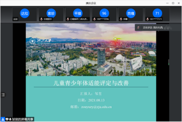 8月13日上午,浙江大学教育学院体育学系“百人计划”研究员邹昱围绕“儿童青少年体适能评定与改善”主题,分享了儿童青少年体适能现状、问题、评价与改善建议。邹昱老师阐述了当前儿童青少年肥胖比例高、身体素质水平低、视力问题日益突出等一系列问题,并介绍了心肺适能、肌肉适能、柔韧适能、身体适能等影响健康体适能的四大要素及其评价方法。结合高原地区特点,邹昱老师就如何提高身体适能水平、改善儿童青少年健康状况、降低健康风险提出了指导准则,重点示范了发展肌肉适能以及柔韧适能的练习方式,并强调,发展体适能的重要意义在于增强儿童青少年的体质健康和心理健康状况。