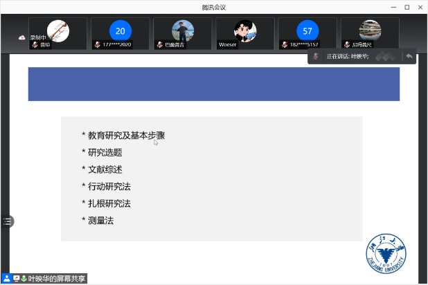 8月12日下午,浙江大学教育学院课程与学习科学系副系主任叶映华教授以“教师科研能力提升”为题,分享了开展教育科学研究的思路和经验。叶映华老师以西藏自治区教育科学研究立项课题名称为例,介绍了教育研究的4个基本步骤,即研究问题提出、研究设计与方法、研究结果和研究讨论与成效分析。她表示,一个好的研究选题,应当是具有“价值”的、且“可行”的,同时应当是基于研究者“研究积累”的。叶映华老师随后强调了文献综述的重要性及其特点,并着重介绍了扎根研究法、行动研究法和测量法的步骤、程序和注意事项。