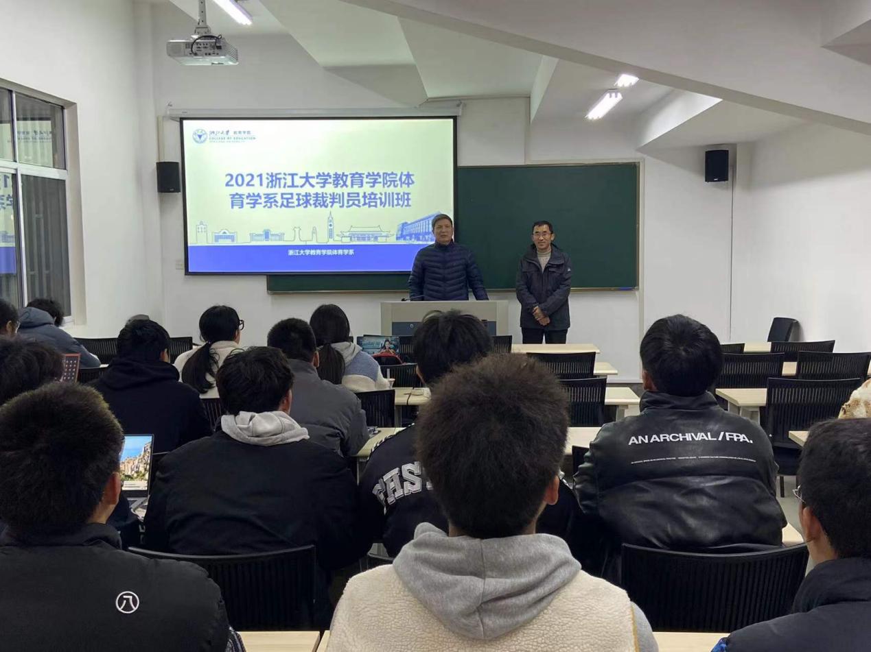 12月24日晚,2021年浙江大学教育学院体育学系足球裁判培训班在西溪校区正式开班。教育学院体育学系党总支书记沈国平老师,中国足球职业联赛裁判监督、浙江省学校体育协会大学足球分会裁委会主任董青教授出席了开班仪式。
