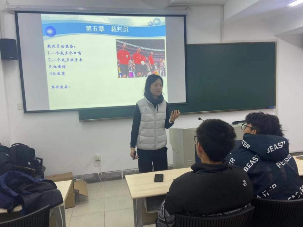 浙江省足协的董青老师和林世琴老师担任本次裁判培训的主讲教师。在培训的两天中,董老师和林老师认真负责,他们结合图片、视频等手段,以独特的角度和方式生动、直观的对足球裁判法、足球规则及裁判过程中的注意事项等进行了详细讲解,内容充实,环环相扣。
