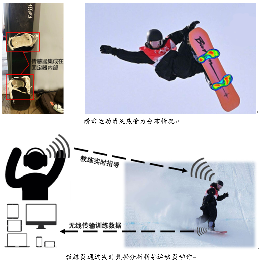 基于以上需求,彭玉鑫研究团队研发了一种用于单板滑雪运动的超薄型足底压力检测系统,集成在滑雪板与运动员的足底之间,可实时分析滑雪运动员在运动过程中发力、受力以及身体姿态状况。同时,滑雪板上集成了惯性传感器、数据采集卡、测控4G云盒子等装置,可以同时实时采集到运动员训练过程中的速度、加速度、角度、横摆角速度等信息。在该系统的支持下,运动员的训练不再只是基于教练员观察、运动员的自身感觉,而是有了精准的数据作为支撑。教练可以在手机、平板或电脑上实时观察滑雪运动员在专项训练中的体能状态、物理速度信息等指标,对运动员技术动作及训练信息进行定量分析与可视化呈现。通过这些数据,运动员的运动状态、训练情况、动作是否达标以及不同运动员之间的技术差别,教练员都可以一目了然。因此长期训练下来,滑雪板监控系统就能逐步建立起滑雪运动员专项训练的关键动作数据库,每个滑雪运动员的特点得以直观展现,从而可对运动员们提供更高效、更具针对性的指导。以上技术对于训练效果的评估而言具有极高的参考价值,是科研服务项目团队助力冬奥的一项跨学科“黑科技”,有效地助力了运动健儿在冰雪赛场上更快、更强。