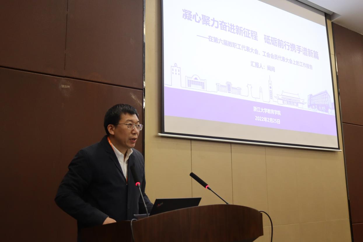 常务副院长阚阅作学院工作报告。他指出,近五年来学院在党的建设、人才培养、师资队伍、学科建设、科研工作、国际化等方面取得较为丰硕的成绩。他强调,站在两个百年的历史交汇点,浙江大学正在迈向世界一流大学的征程上奋力“走在前列”,教育学院则要接续奋斗,持续攻坚,统筹推进“五链融合”,开展实施“十项行动”,努力推动“十四五”事业发展和新一轮“双一流”建设,进一步优化体系、完善制度、创新模式、提升能力、加强保障,更高质量推进教育学院的建设和发展。