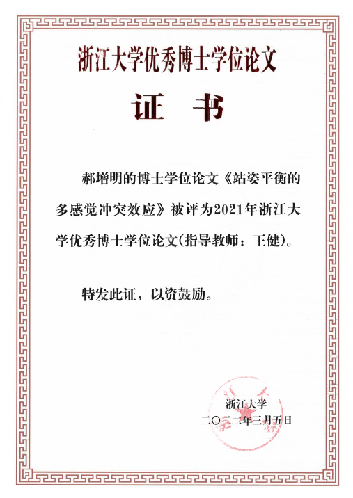 近日,学校发布2021年浙江大学优秀博士学位论文名单,我院2021届体育学专业博士毕业生郝增明的博士学位论文《站姿平衡的多感觉冲突效应》获评2021年浙江大学优秀博士学位论文,指导教师为体育学系王健教授。