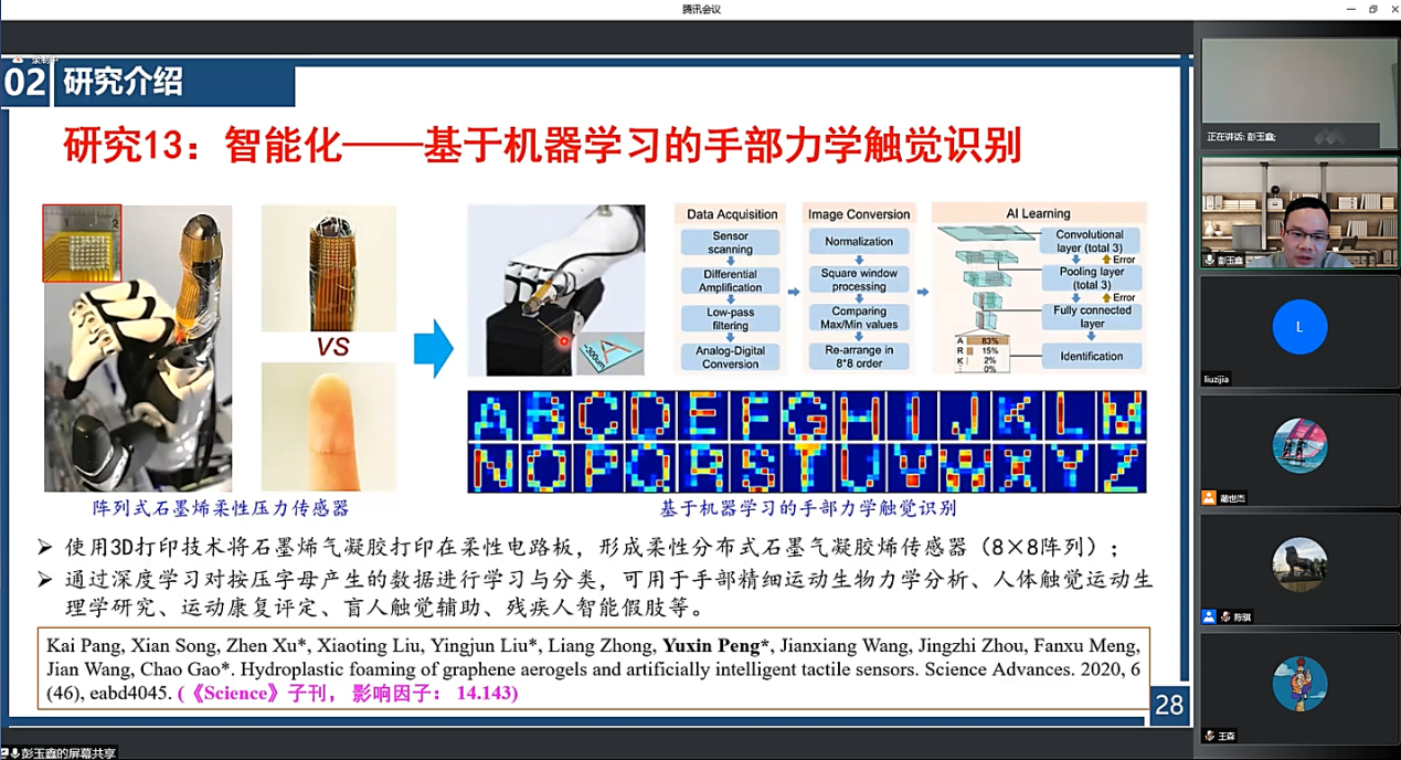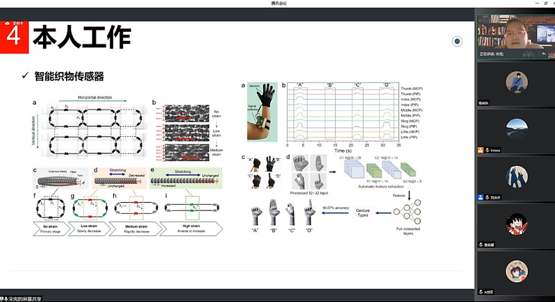 同时,体育学系博士生宋宪、杨毅、王健翔、仲亮等参与了本次会议,并分别作题为“基于石墨烯新材料薄膜的柔性传感器”(宋宪)、“基于可穿戴式足底三维测力系统的步态识别研究”(杨毅)、“一种自感知柔性康复机械手的研究”(王健翔)、“手部双模态柔性传感系统研究及其在手部运动中的应用”(仲亮)等主题报告。