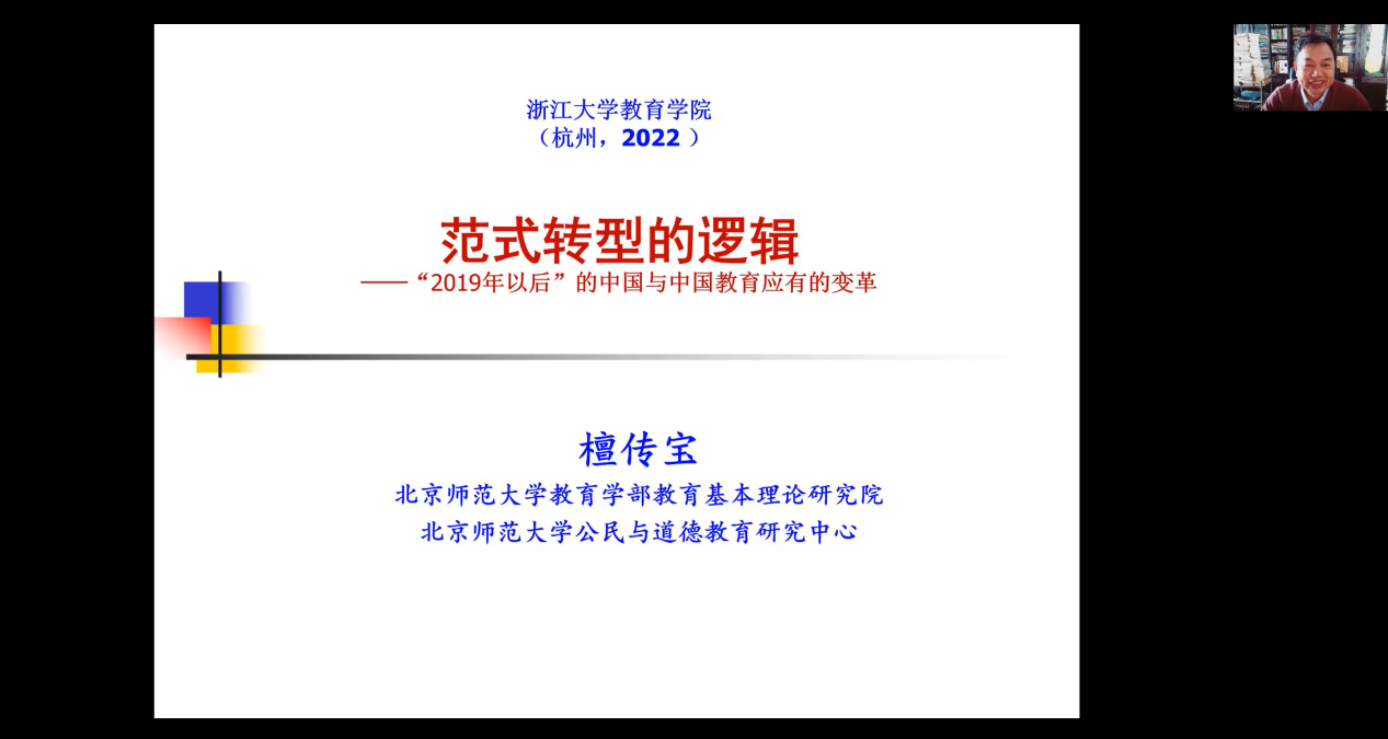 3月19日,浙江大学教科书研究中心、教育部浙江大学基础教育课程研究中心第20次学术讲座活动以腾讯视频会议的形式在线上成功举行。北京师范大学教育基本理论研究院教授兼教育学部学术委员会主席、全国德育学术委员会理事长檀传宝教授,为大家带来题为“范式转型的逻辑——‘2019年以后’的中国与中国教育应有的变革”的学术讲座,本次讲座由浙江大学教科书研究中心主任、教育部浙江大学基础教育课程研究中心常务副主任刘正伟教授主持,线上参会师生人数达五百余名。