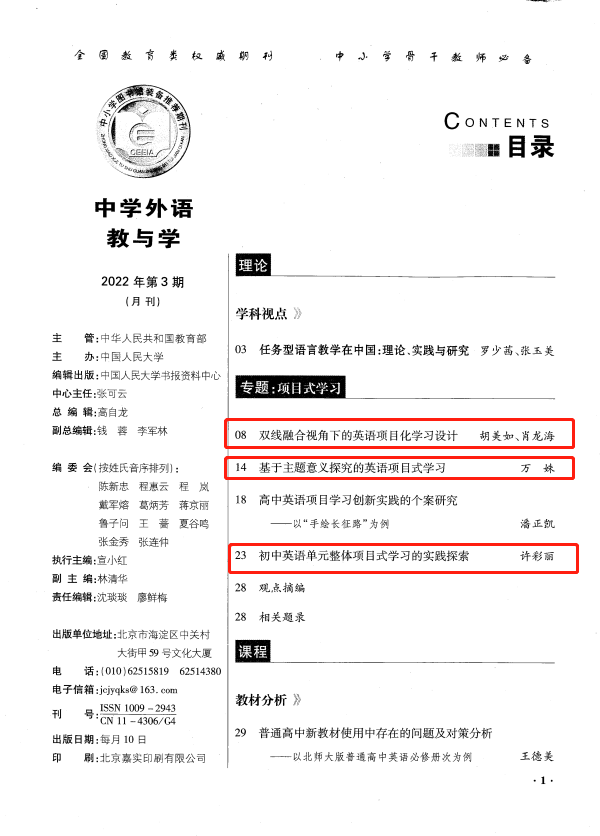 2022年第3期人大复印报刊资料《中学外语教与学》的“项目式学习”专题全文转载了四篇论文,浙江大学教育学院课程与教学论专业肖龙海教授研究团队的三篇论文入选。被转载的三篇论文分别为:《双线融合视角下的英语项目化学习设计》(胡美如和肖龙海),2021年10月发表于《课程•教材•教法》;《基于主题意义探究的英语项目式学习》(万姝),2021年10月发表于《中小学外语教学》;《初中英语单元整体项目式学习的实践探索》(许彩丽),2021年12月发表于《教学月刊》。
