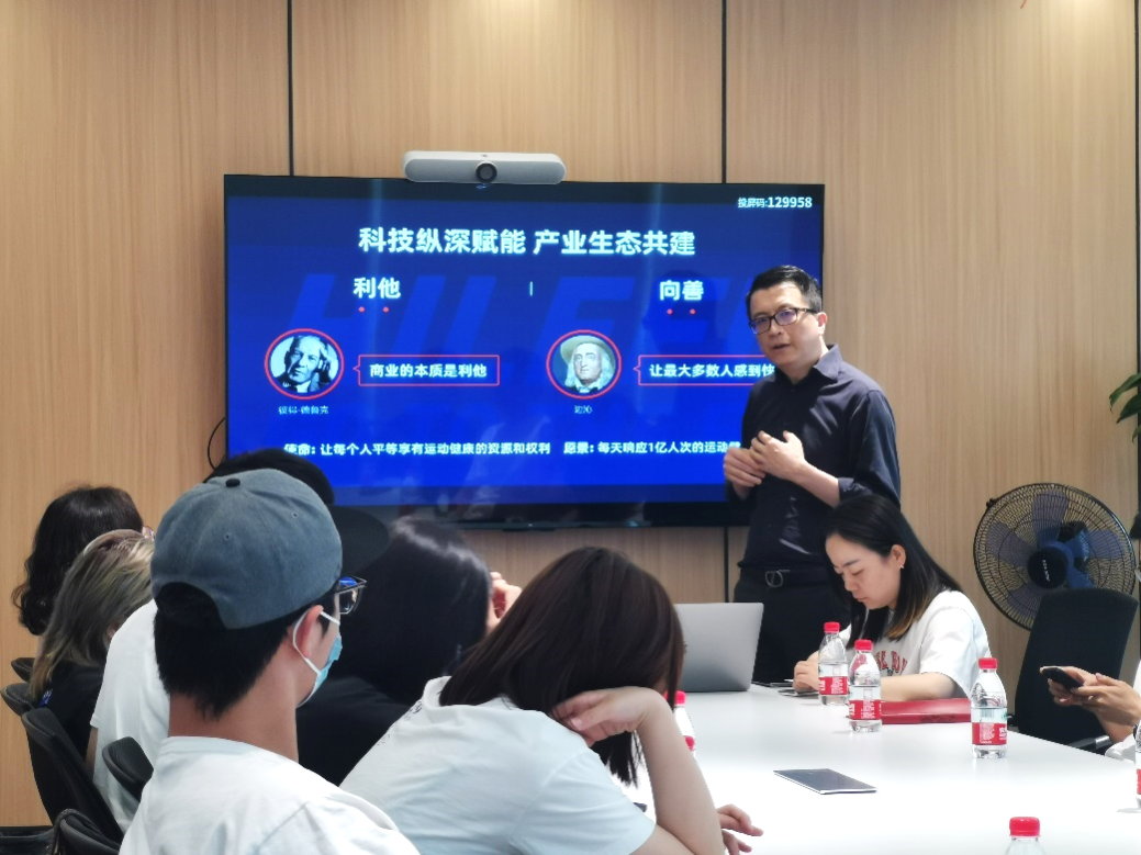 师生一行到达乐刻运动总部后,受到乐刻运动CEO韩伟先生及公司高管的热情接待,在他们的带领下师生依次参观了公司健身文化展示区、员工工作区、会议与休息室等区域,了解了公司的工作制度、组成架构与员工情况。