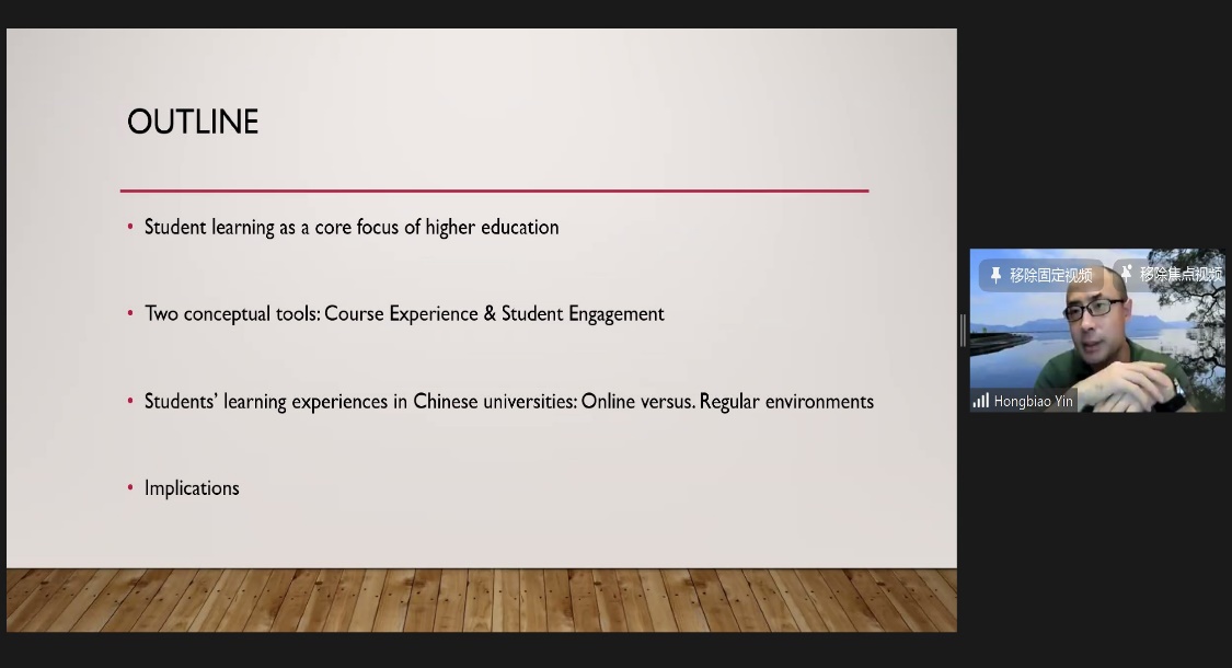 5月27日,香港中文大学课程与教学系系主任尹弘飚教授为大家带来题为“线上和常规环境下的大学生学习体验”的精彩报告。尹教授分析了学生学习是高等教育的核心重点,介绍了课程体验和学生参与两个研究中所应用的概念性工具,同时分享了他对中国大学学生在线和常规环境的学习体验的研究,系统性地介绍了他已完成的相关系列研究的思路、设计、结果与启示。在讲座互动环节,同学们纷纷结合自己在线与常规环境的学习体验进行提问,尹教授对同学们的疑问一一耐心解答。