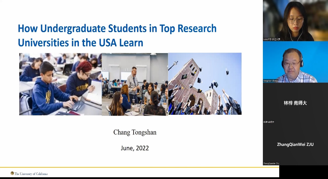 6月4日,美国加州大学常桐善教授以“美国顶尖公立大学本科生是怎样学习的”为题作了主题报告。常教授分别从目前国外顶尖大学的毕业要求、重大变革、课程修读、参与校内外活动等方面进行讲解。常教授认为,培养优秀大学生很重要的一点是发展核心竞争力,从学生的思维、学术、设计等多方面进行培养。常教授总结了国外顶尖大学的三个特点:为大学生提供明确的发展方向、丰富学生的学习机会、让学生参与和组织更多活动。在问答环节,同学们积极提问,常教授从疫情下的学习、线上线下教学是否具有替代性等方面进行了耐心的解答。常老师认为疫情是对我们的考验,在未来线上教学可能会更加常用,但线上教学无法代替线下教学,因为线上教学没办法更好地关注同学,而线下教学可以更加及时地得到同学们的反馈。