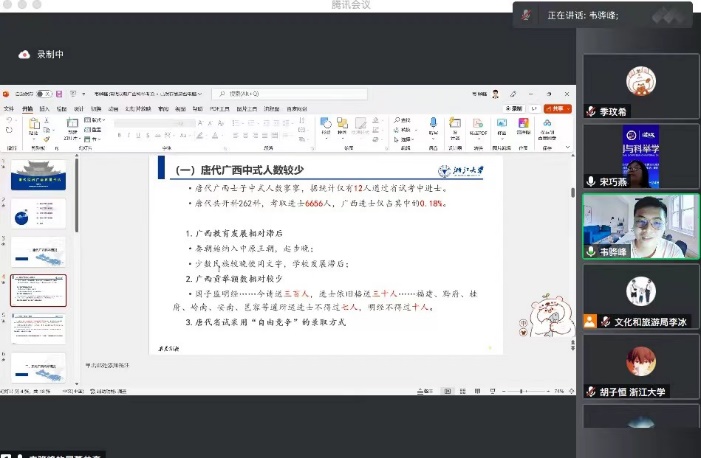 在分论坛上,浙江大学教育学院“百人计划”研究员李木洲以“宋代科举考官锁院活动探析——以锁院诗为中心的考察”为题作了线上论文报告。博士后朱沛沛以“中国科举研究三十年历史回顾”为题、博士生苑津山以“三十年来科举学的形成与发展”为题、博士生袁浪华以“察举制向科举制流变的动力分析”为题、博士生钟伟春以“科举制度下家道结构变迁与家庭成员角色”为题、博士生曾思鑫以“明清乡试录取率综考”为题、博士生赵凯以“科举交往史:由关系视角下移的科举史”为题、博士生傅冠华以“晚清顺天与山西乡试借闱的比较研究”为题、硕士生孙艺源以“基于科举与高考的比较反思我国区域公平问题”为题,分别按主题分类在现场作了论文报告;博士生韦骅峰以“清代以前广西科举考论”为题在线上作了报告。