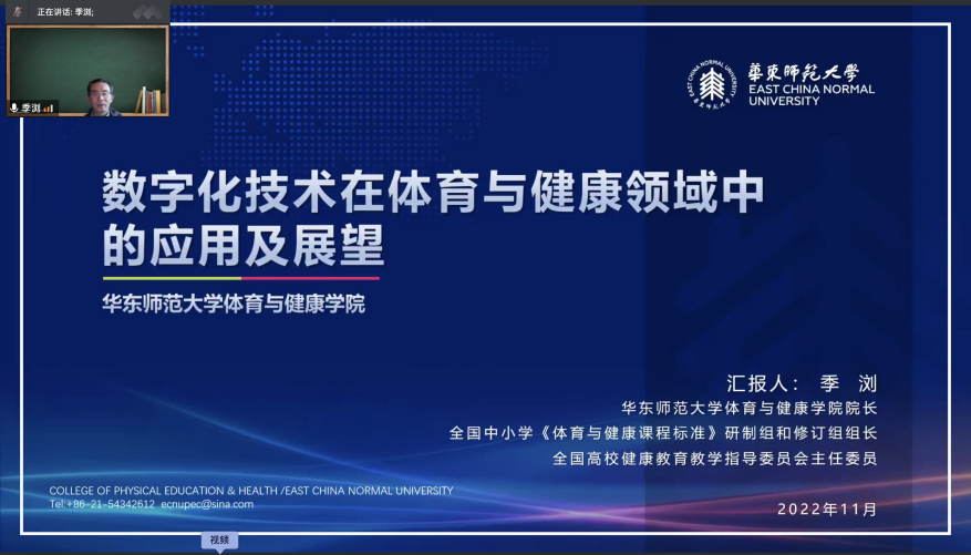 11月19日上午的学术报告由华东师范大学季浏教授、北京体育大学洪平研究员、浙江省人民政府咨询委员会刘亭研究员分别作了“数字化技术在体育与健康领域中的应用及展望”“弘扬北京冬奥精神,推动体育事业高质量发展”以及“数智科技与体育健康”的主题报告。从运动健康促进、奥运争光、体育产业等角度强调了数智赋能的理论与实践价值。