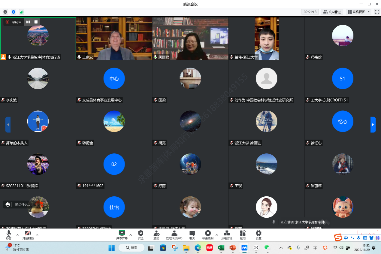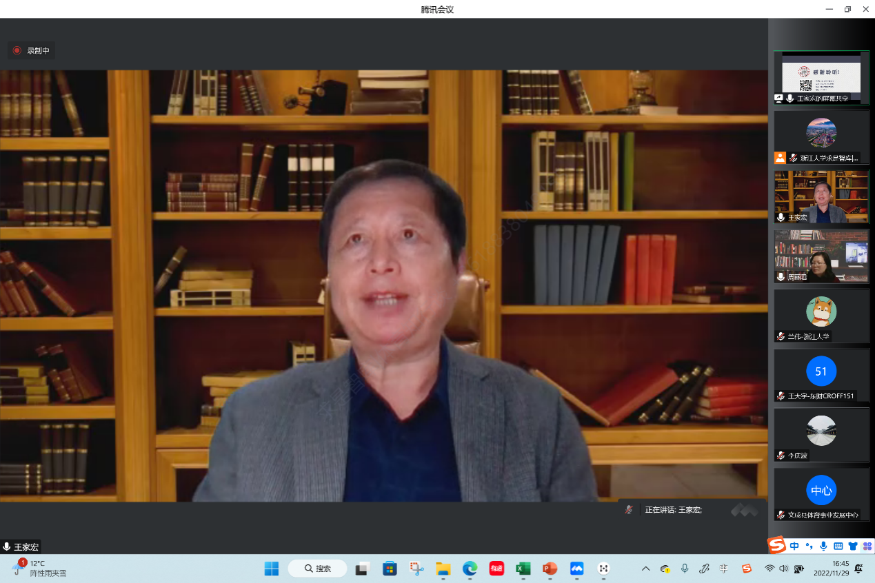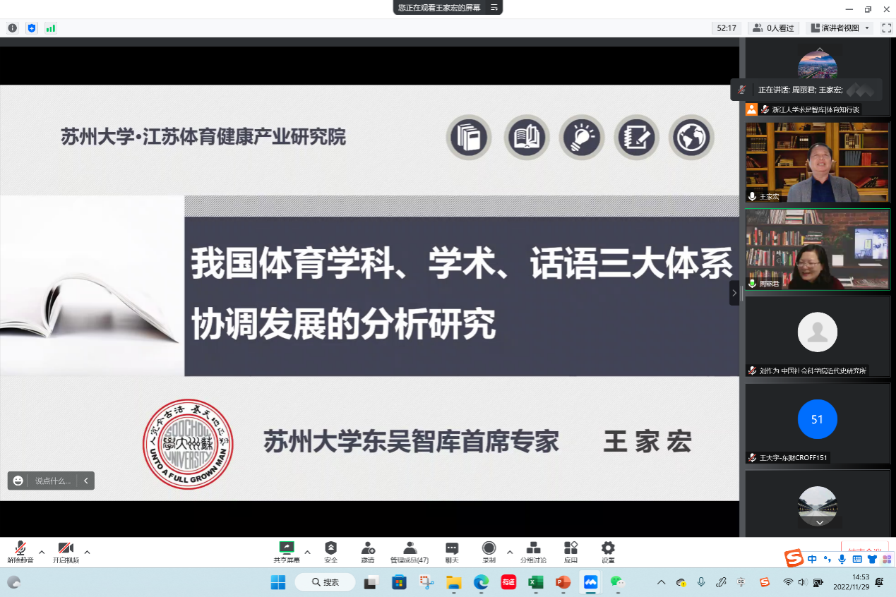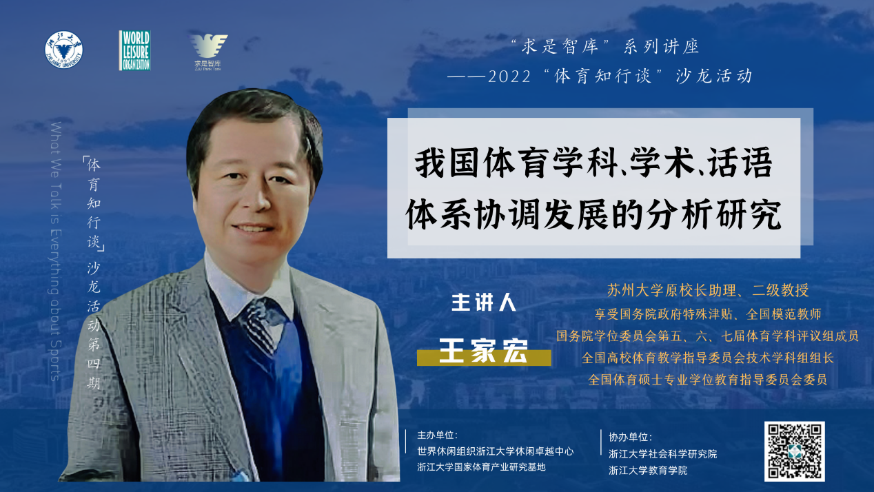 11月29日下午,“求是智库——‘体育知行谈’”系列讲座第四期以线上形式圆满举办。本期邀请苏州大学原校长助理、二级教授、全国模范教师、国务院学位委员会第五、六、七届体育学科评议组成员、全国高校体育教学指导委员会技术学科组组长王家宏教授为我院师生作题为“我国体育学科、学术、话语三大体系协调发展的分析研究”的讲座。此次讲座吸引了逾100名听众在线上参与,讲座由世界休闲组织浙江大学休闲卓越中心主任、浙江大学国家体育产业研究基地主任周丽君教授主持。