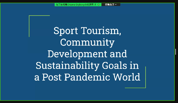 会议议题二—— Sport, Leisure and Social Culture(运动休闲与社会文化),由浙江大学高乃春副教授主持。北爱荷华大学Oksana Grybovych博士、Dr. PLAY, Inc.创始人兼执行董事Winnie Cheuk WONG博士以及浙江大学博士生兰伟分别发表主题演讲。Oksana Grybovych教授的演讲主题为“后疫情世界下体育旅游、社区发展与可持续发展目标”。Oksana Grybovych博士首先介绍了体育旅游、社会发展、可持续发展的定义及分类,接着结合联合国可持续发展2030目标中第11项目标(建设包容、安全、坚韧和可持续的城市与人类社区),阐述了新冠疫情对于体育旅游发展的影响。Winnie Cheuk WONG博士专注于新的教育模式:Learn through Play(以玩促学)。首先Winnie Cheuk WONG博士强调了“玩”在这个时代的重要性,并且通过分析Angie 教育哲学(Angie Education Philosophy)的核心理念,让听众了解“玩”对于孩子发展的重要性以及如何实现“玩中学”这种新的教育模式。兰伟博士生的研究关注体育文化如何驱动中国乡村空间重构。他的研究首先介绍研究背景及问题,并通过案例分析提出理论思考。通过分析淳安界首自行车小镇、石林港湾体育小镇、上虞岭南灵运攀浪小镇以及杭州市郊区新港村4个浙江省乡镇体育项目,他提出了体育文化驱动乡村空间重构的机制。