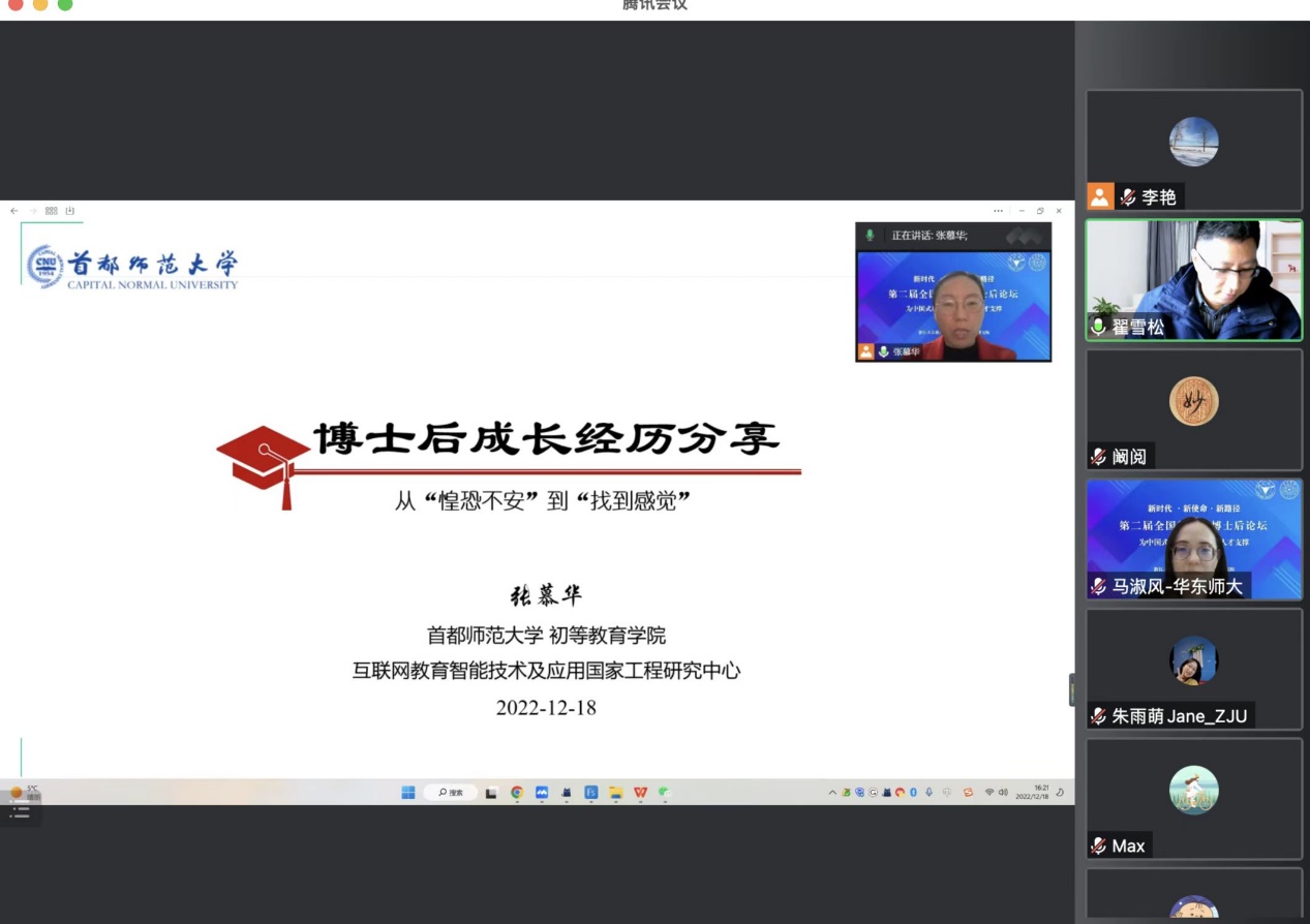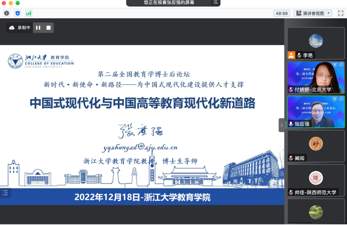 12月18日,由浙江大学教育学院和清华大学教育研究院联合主办的第二届全国教育学博士后论坛圆满举行。本次论坛以“新时代·新使命·新路径——为中国式现代化建设提供人才支撑”为主题,设置特邀专家主旨报告、在站博士后主旨学术报告和主题分论坛、优秀博士后成长分享论坛,以及教育学博士后培养单位院长论坛等环节,国内外多所大学的博士后和关心博士后议题的近千名师生在线参与和观看了本次论坛内容。